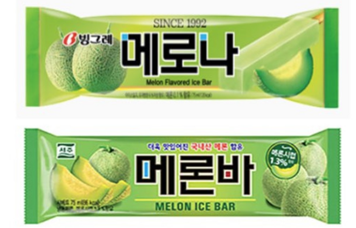빙그레의 메로나(사진 위쪽),서주의 메론바. [[사진출처 = 각 사] 빙그레가 자사 아이스크림 제품인 ‘메로나’와 비슷한 포장지 디자인을 사용한 경쟁 업체를 상대로 소송전을 벌였지만 패소했다. 과일을 소재로 한 제품에 있어 그 과일이 가지는 본연의 색상은 누구라도 이를 사용할 필요가 있다는 게 법원의 판단이다.