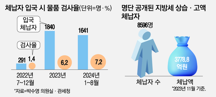 15일 국회 기획재정위원회 박수영 국민의힘 의원이 관세청으로 받은 자료에 따르면 제도가 시행된 2022년 이후 지난 8월까지 해외에서 입국해 세관을 거친 체납자는 모두 3772명이었는데 이 중 휴대품 검사를 받은 경우는 236명으로 전체의 6.3%에 불과했다. 제도 시행 첫 해인 2022년 하반기 검사율은 1.4%에 불과했고 2023년 6.2%,올해는 7.2%였다.