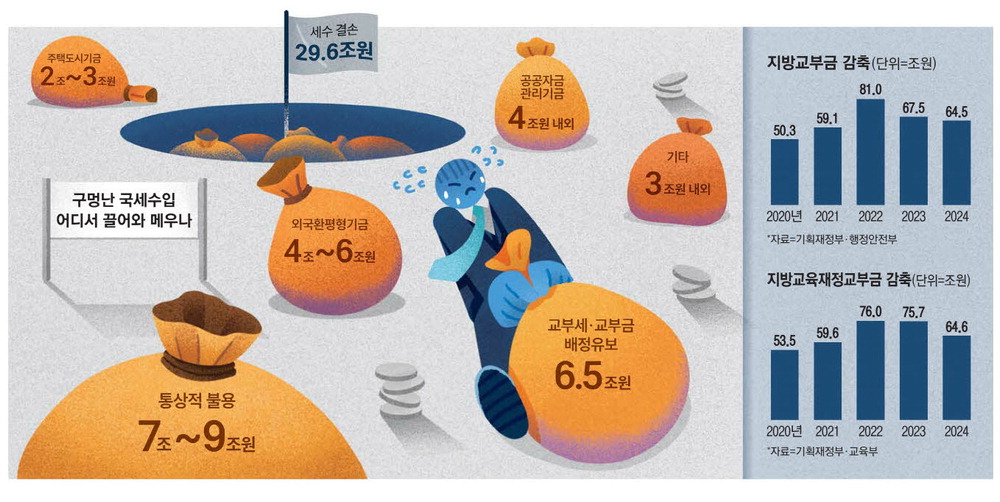 2년 연속 세수 추계에 실패한 정부가 세수 부족분을 메우기 위해 외국환평형기금(외평기금),주택도시기금,공공자금관리기금에서 14조~16조원을 '영끌'하기로 해 논란이 예상된다.