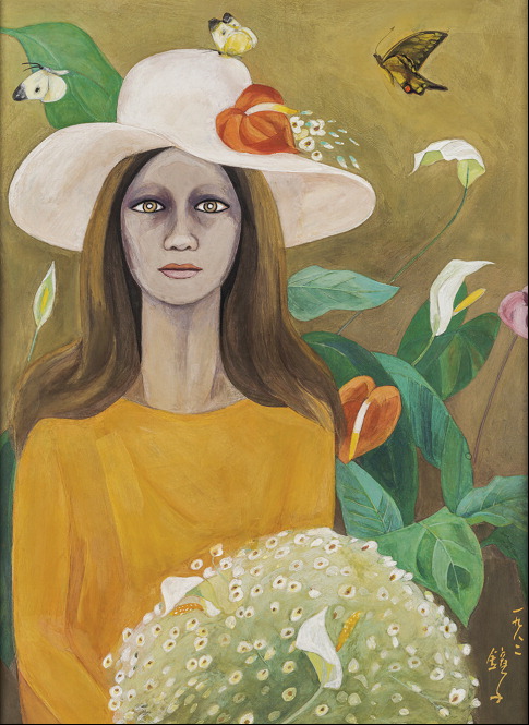 전시실에 들어서면 천 화백이 그린 한 여인이 관객과 눈을 맞춘다. 1982년 작 '길례언니Ⅱ'다. 흰 모자를 쓴 여성의 모자 챙 위로 세 마리의 나비가 지나가는데,이 여성을 둘러싼 식물의 이미지는 천경자 화풍의 중추를 관찰하기에 더없이 적당하다. 천 화백이 그린 '길례'가 누구인가. 고흥보통학교 3년 선배 임길례 씨로,훗날 소록도에서 간호사로 일한 인물이다. 천 화백이 재해석한 길례는 '구원의 상징이자 순수함,아름다움의 총체'가 된다.