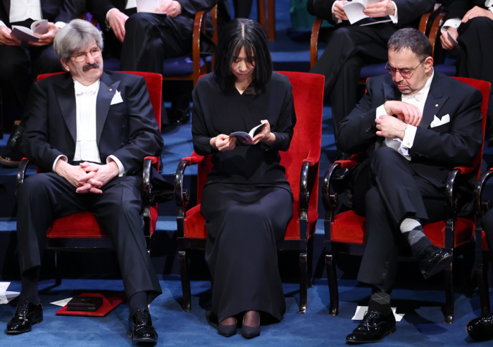 또 다른 수상자들은 노벨상 증서(디플로마)와 노벨 메달을 수상한 뒤 의자 아래 바닥에 놓고 편하게 앉아 있었는데,한강 작가만 무릎 위에 증서와 메달을 올려놓아 대조적인 풍경이었다.