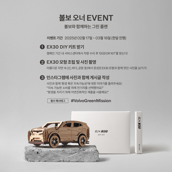볼보코리아,EX30 출시 기념 ‘2025 시즈널 서비스 캠페인’ 진행 [사진제공=볼보코리아] 오는 3월 16일까지는 ‘볼보와 함께하는 그린 플랜’ 소셜네트워크서비스(SNS) 이벤트를 진행한다. 서비스센터에서 받은 ‘볼보 EX30 DIY 키트’를 조립한 후 바다·산·공원 등 자연 속에서 완성된 EX30의 모형과 함께 사진을 촬영하고 해시태그(VolvoGreenMission)와 함께 SNS에 업로드하면 된다. 추첨을 통해 총 100명에게 스타벅스 e-기프트카드(3만원권)를 증정한다.