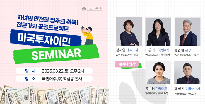 < 사진 제공 : 국민이주㈜ > 한편,국민이주㈜는 오는 22일 오후 2시 서울 역삼동 본사에서 미국투자이민 세미나를 개최할 예정이다. 이번 세미나에서는 이유리 미국 변호사의 자녀 영주권 설계법,김지영 대표의 투자이민 전략과 프로젝트 선정 방법 등 다양한 전문가 강연이 준비돼 있다. 특히 최근 트럼프 행정부의 혼란스러운 정책 변화에 대응하는 안정적 투자 전략과 공공 프로젝트의 장점을 자세히 소개할 예정이어서 투자자들의 기대감과 참여 열기가 더욱 뜨거워지고 있다.