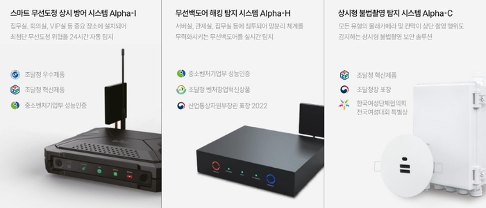 지슨은 공공부문 점유율 1위를 자랑하는 보안솔루션을 출품한다. 무선도청 방어 시스템 ‘알파-I’,무선백도어 해킹 탐지 ‘알파-H’,불법촬영 보안 솔루션 ‘알파-C’등이다. 지슨은 그동안 국내 시장에서 입증된 제품력으로 글로벌 보안 시장을 본격적으로 공략하겠다는 전략이다.