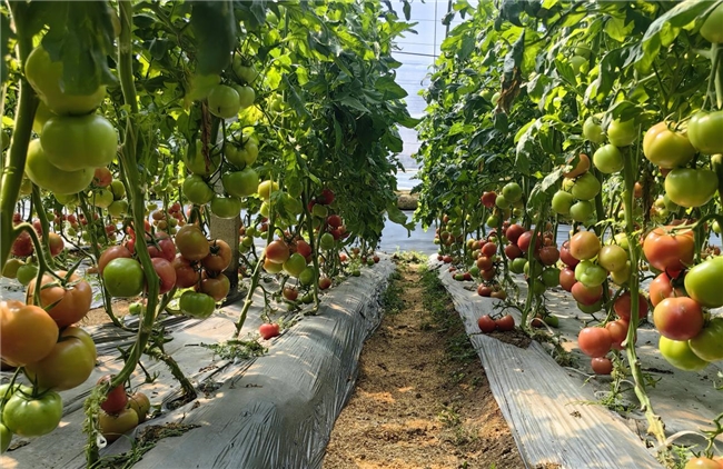 봄날씨가 찾아오면서 담성군 양집읍의 과채류 재배지에 활기찬 모습이 펼쳐지고 있다. 특히 토마토 가지에는 성숙한 열매가 촘촘히 달려 있어, 붉은 듯 익은 과실들은 마치 불타는 작은 등불처럼 녹색 잎사귀 사이에 반짝이며 장식하고 있다. 일렬로 정렬된 덩굴들은 수직으로 뻗어 올라가며, 농부들은 그 사이를 오가며 수확,분류,포장에 몰두해 활기찬 농사 분위기를 연출하고 있다.