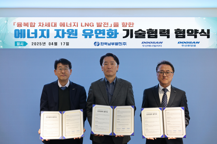 (왼쪽부터) 김덕수 두산에너빌리티 상무와 신춘호 신세종빛드림본부장,이승준 두산퓨얼셀 본부장이 에너지 자원 유연화 기술 업무협약식에서 기념사진을 찍고 있다. [사진 = 한국남부발전] 한국남부발전은 신세종빛드림본부가 지난 17일 신세종본부 대회의실에서 두산에너빌리티,두산퓨얼셀과 ‘융복합 차세대 LNG 발전 향한 에너지 자원 유연화 기술’ 업무협약을 체결했다고 21일 밝혔다.