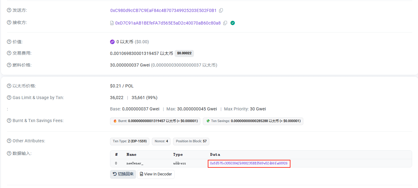 더 우려되는 점은 핵심 권한이 사라지지 않았다는 것입니다. 0xD7C9…c80a8 국고/민팅 프록시는 OpenZeppelin 투명 프록시 패턴을 사용하며, ProxyAdmin(0x880913…d80aF)은 transferOwnership, renounceOwnership, upgradeAndCall 메서드를 그대로 보유합니다. 또한 새 배포자/운영자로 태그된 0x5f575c…8926은 7~8월 동안 미검증 계약(0xB228B9…6327)을 자주 호출합니다. 이는 권한 포기가 아니라 운영 이양을 시사합니다.