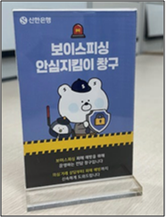 25일 신한은행은 전국 모든 점포에 보이스피싱 안심지킴이 창구 설치를 완료하고,안내판 등을 세우며 본격적인 활동을 시작했다. 금융당국이 보이스피싱 피해 예방을 위해 금융권의 선제적이고 적극적인 대응을 강조하고 나선 가운데,고객이 신한은행 어느 영업점에 와도 관련해 전문 상담을 우선적으로 받을 수 있게 된 것이다.