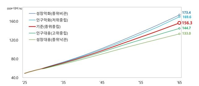 국가채무비율은 인구 시나리오별로 144.7~169.6% 범위에서,성장 시나리오별로는 133.0~173.4% 범위에서 변동할 것으로 예상됐다. 중간값에 해당하는 기준 시나리오 결과(156.3%)는 한국개발연구원(KDI·2060년 144.8%),국회 예산정책처(2072년 173.0%) 등의 전망과 엇비슷한 수준이다.