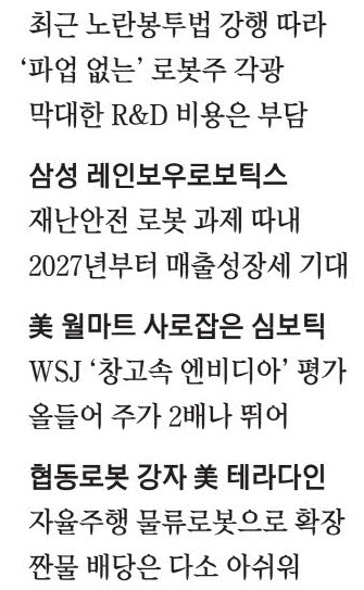 미국에선 협동로봇 상장사 테라다인과 심보틱의 주가가 반등세다. 지난달 GE에어로스페이스 노동자 파업은 미국에서 자동차 위주 파업이 항공·방산까지 확대될 수 있다는 의미로 주목받았다. 미국에선 노조 리스크만큼이나 훈련된 인력이 없어서 문제다. 월스트리트는 '로봇을 통한 자동화'를 노조 비용 증가와 숙련공 부족을 한꺼번에 해결할 수 있는 대안으로 제시하고 있다. 이는 협동로봇을 만드는 테라다인과 공장 자동화 선두주자 심보틱과 같은 나스닥 상장사로 돈이 몰리는 계기가 되고 있다.