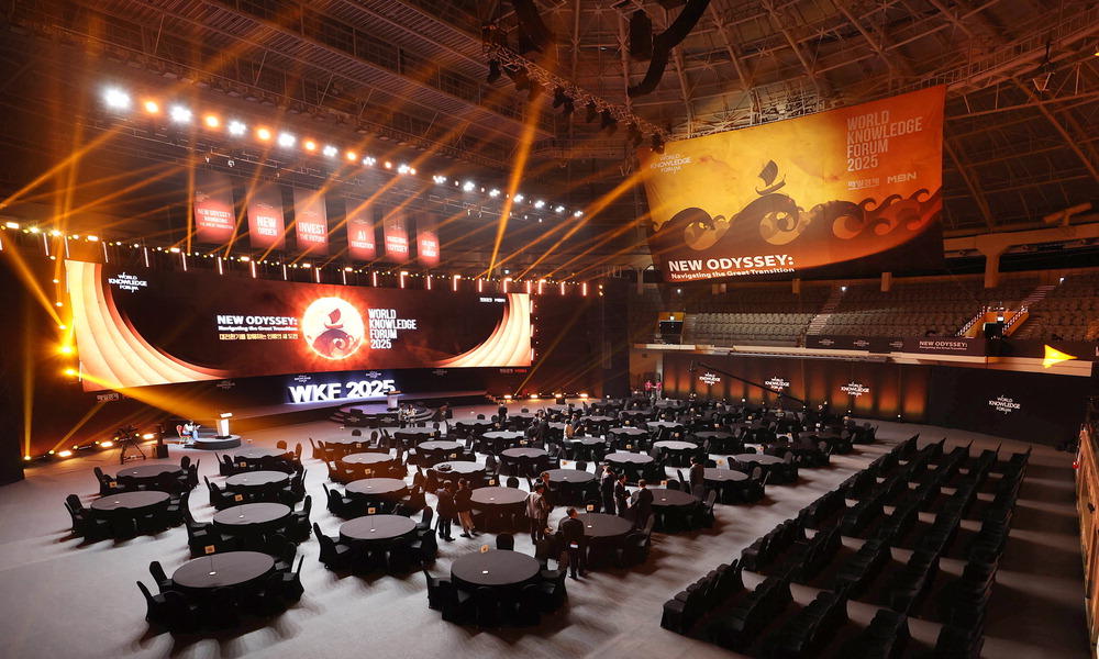 지식의 대향연 개막 앞두고 분주한 장충아레나 제26회 세계지식포럼 개막을 하루 앞둔 8일 개막식이 열리는 서울 중구 장충아레나에서 행사 준비가 한창이다. 개막식에서는 쥐스탱 트뤼도 전 캐나다 총리가 특별연설을 하고 이어 리처드 텡 바이낸스 CEO와 재러드 다이아몬드 UCLA 명예교수 등이 연단에 선다. 이충우 기자