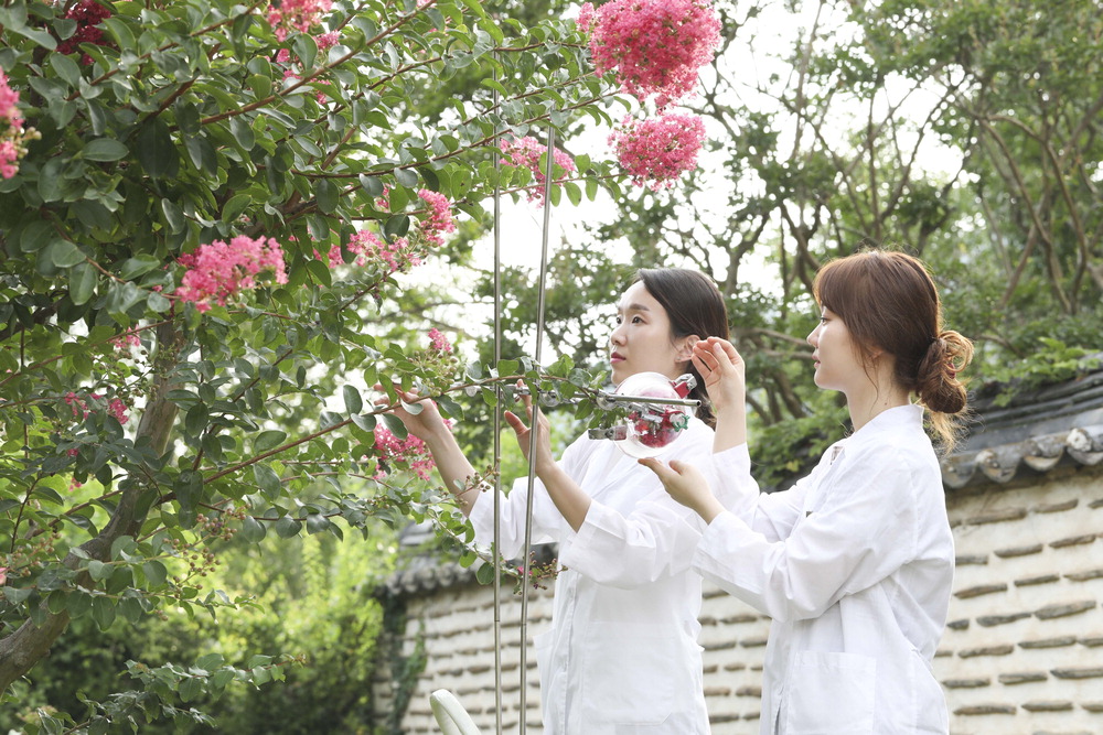 코스맥스 연구원들이 꽃을 훼손하지 않는 센트리티지 기술로 향을 포집하고 있다. 코스맥스