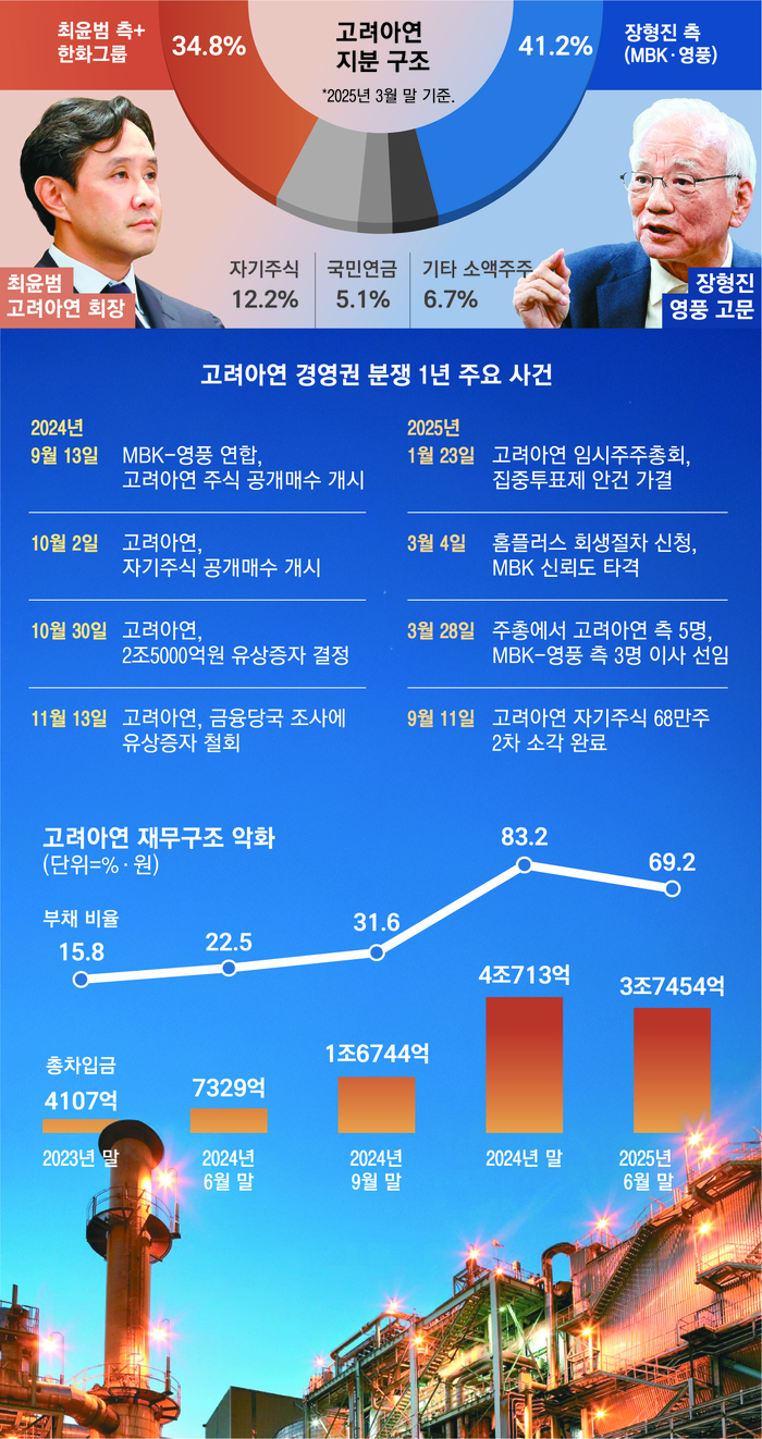 경영권 분쟁은 지난해 9월 13일 MBK·영풍 측이 고려아연 지분 공개매수를 통해 최윤범 회장 측을 상대로 전쟁을 선포하면서 시작했다. MBK·영풍 측이 적대적 인수·합병(M&A) 작업을 시작하며 내건 명분은 ‘거버넌스 개선’과 ‘기업가치 제고’였다.