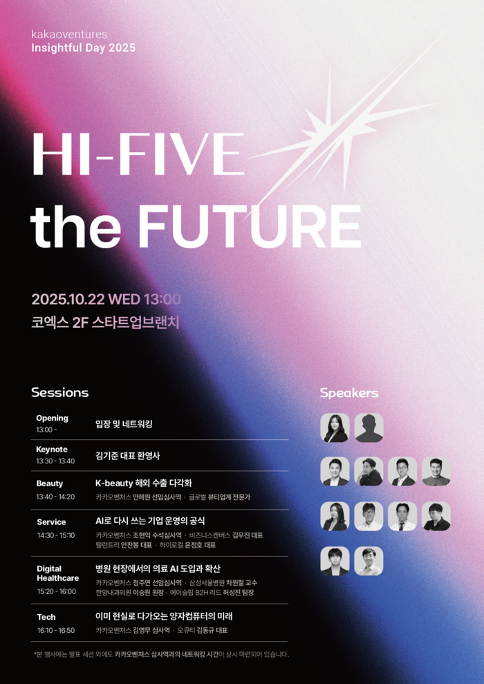KV 인사이트풀데이는 카카오벤처스 투자 심사역과 각 분야 전문가가 산업에 대한 다양한 관점을 공유하는 행사다. 올해 주제인 ‘미래를 향한 하이파이브’는 미래와 맞닿은 오늘을 의미하는 동시에,창업가와 투자자가 서로를 응원하는 의미를 담았다. 지난해 인사이트풀데이에서 ‘혁신 너머의 미래’를 함께 고민하며 논의의 지평을 열었다면,올해는 현장에서 만들어지고 있는 새로운 기회를 살펴볼 예정이다.