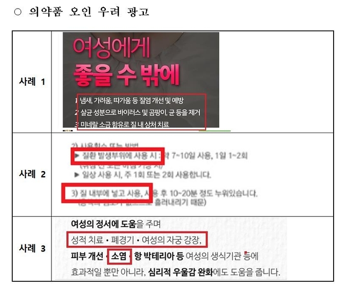 의약품 오인 우려 광고의 경우 ‘질염에 진짜 도움이 되는’,‘피부 면역력 증진’ 등 문구가 대표적이었다.