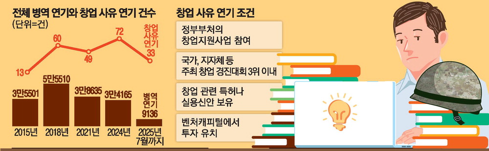 28일 병무청에 따르면 창업을 사유로 병역을 연기한 건수는 2015년 13건에서 2018년 60건,2021년 49건,지난해 72건으로 크게 늘었다. 올해는 7월까지 33건을 기록했다. 같은 기간 병역 연기 전체 건수는 3만5501건,5만5510건,3만8635건,3만4165건이었고,올해는 7월까지 9136건으로 줄어드는 추세다. 병역 연기 사유는 질병 또는 심신장애,시험 응시,취업,창업 등 다양한데 창업을 사유로 한 연기는 2014년 3월부터 현역병 입영업무 규정 제26조에 신설됐다.