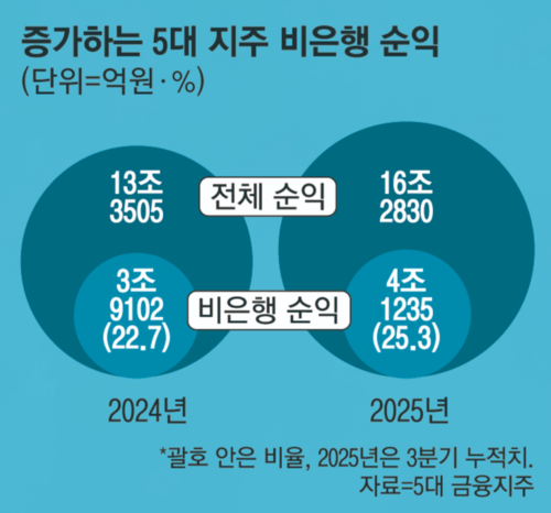 비은행 쪽 CEO 임기가 대거 만료되는 상황에서 최근 몇 년간 비은행 부문이 각 금융지주에서 차지하는 중요성은 점차 커지는 모양새다. 5대 금융지주 내 비은행 부문의 순익 비율은 지난해 22.7%(3조9102억원)에서 올해 25.3%(4조1235억원)로 전체 대비 4분의 1 수준까지 올라왔다.