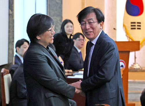 정은경 보건복지부 장관(왼쪽)과 정기현 의료혁신위원장이 11일 열린 제1차 의료혁신위원회에서 인사를 나누고 있다. 연합뉴스