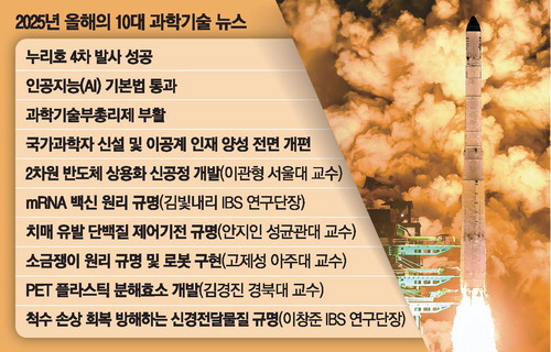 한국과학기술단체총연합회가 누리호 4차 발사 성공,인공지능(AI) 기본법 통과 등이 포함된 '2025년 올해의 10대 과학기술 뉴스'를 29일 발표했다. 과학기술계 전문가들의 심의와 대국민 투표 결과를 반영해 713개의 뉴스 중 10개를 선정했다. 정진호 한국과학기술한림원 원장은 "미래를 대비하는 정책과 과학의 판도를 바꾸는 연구가 많았다"고 평가했다.