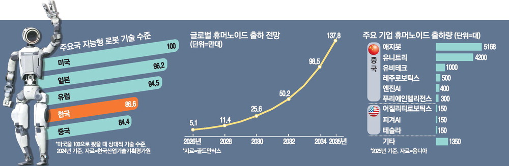 업계에서는 중국의 휴머노이드 로봇 기술이 한국을 크게 앞선다고 평가하고 있다. CES 2026에서 보스턴다이내믹스의 아틀라스가 큰 관심을 받았지만 이는 사실상 미국 기업 기술이고 LG전자의 클로이드도 양산 제품으로 보기에는 이르다고 평가된다. CES에서 한국 기업들이 많은 관심을 받았지만 한국의 로봇 산업 자체 경쟁력은 낮다는 것이다.