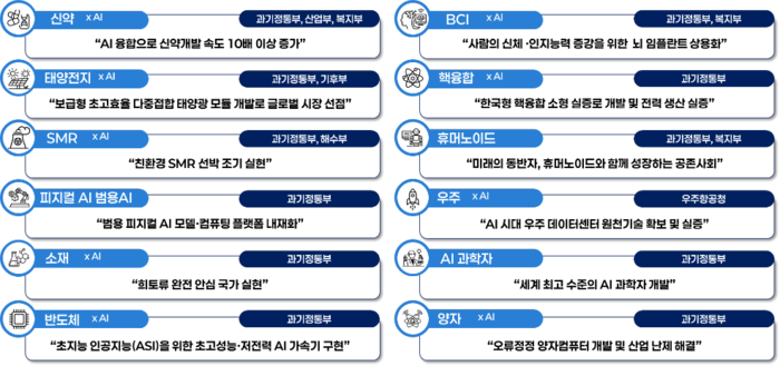 정부는 범용 피지컬 AI 모델 개발,우주 데이터센터 기술 확보,AI 융합으로 신약 개발 속도 10배 이상 증가 등 8대 분야 12대 국가 미션을 확정했다.